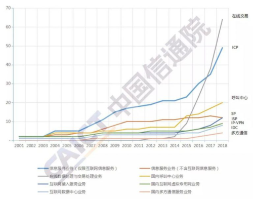 而从政策的结果来看,根据中国信通院发布的《外商投资电信企业发展态势(2018年度)》报告,截至2018年底,获得工业和信息化部许可和上海市通信管理局批复的外商投资电信企业共121家,同比增长39%。 从许可数量上看,在线数据处理与交易处理业务位居首位,信息服务业务居第二位,国内呼叫中心业务仍居第三位,该三项业务许可数量占全部业务许可颁发数量的 81%。 ![]() 数据来源:中国信通院《外商投资电信企业发展态势(2018年度)》 从2001年至今,外商投资电信企业各项业务整体呈上升趋势。 ![]() 数据来源:中国信通院《外商投资电信企业发展态势(2018年度)》 未来中国电信领域是否会更加开放?资深金融从业人士刘晓忠在《新京报》发表文章表示“开放的大门正在打开,乐观预期在不远的将来。未来,外国电信运营企业会逐渐在中国国内获得虚拟电信运营商的资格,从事提供内容、手机业务等服务”。 在他看来,一方面现在阿里、腾讯、百度、京东等已经获得虚拟电信运营商资格,我国在电信领域改革方面已经在国内积累了一定基础。另一方面,数字经济的发展打破了三大运营商的垄断,移动通讯、电信等领域的竞争已经相对充分(比如微信、微信语言电话、视频电话等的出现),进一步开放的风险是可控的。 对此,我们拭目以待。 综编自新华网、经济日报、每日经济新闻、新京报等。 ![]()